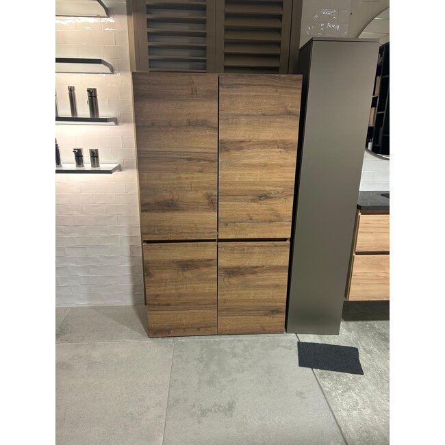Primabad badkamerkast in de kleur sherwood. De badkamerkast heeft 4 greeploze deuren en 3 glazen legplanken waarmee 5 opbergvakken gecreëerd kunnen worden.